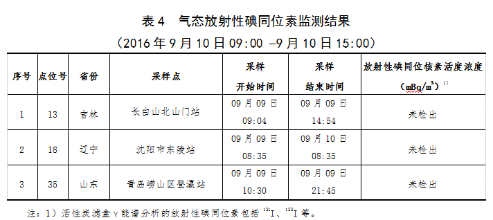 吉林、辽宁和山东3个省份3个监测点采集空气中碘,γ能谱分析结果表明,均未检出人工放射性碘同位素。